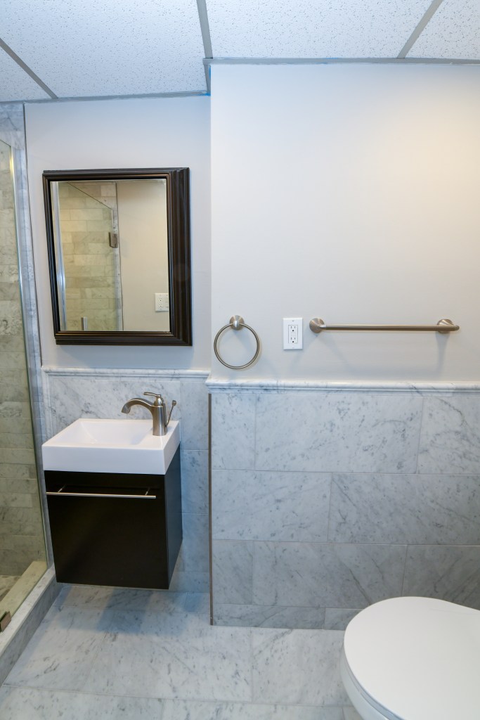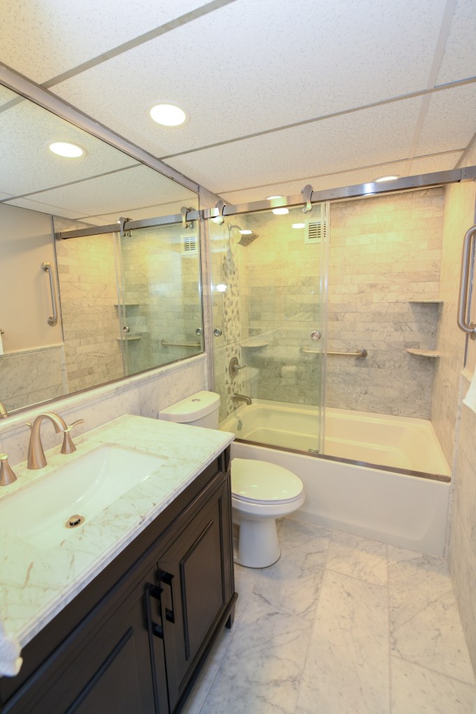Elegance LLC’s bathrooms are designed to provide the client with a memorable experience. From the use of premium materials (hardwood cabinets, quartz countertops, marble tile floors, wall sections and shower surrounds), leading manufacturer’s premium fixtures including plumbing fittings, bathtubs and sliding glass door assemblies to the use of superior safety features and elevated toilet assemblies, the bathroom user is treated to a first-class experience matched only by luxury hotel accommodations.