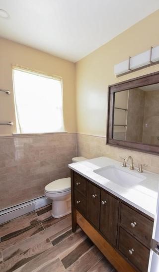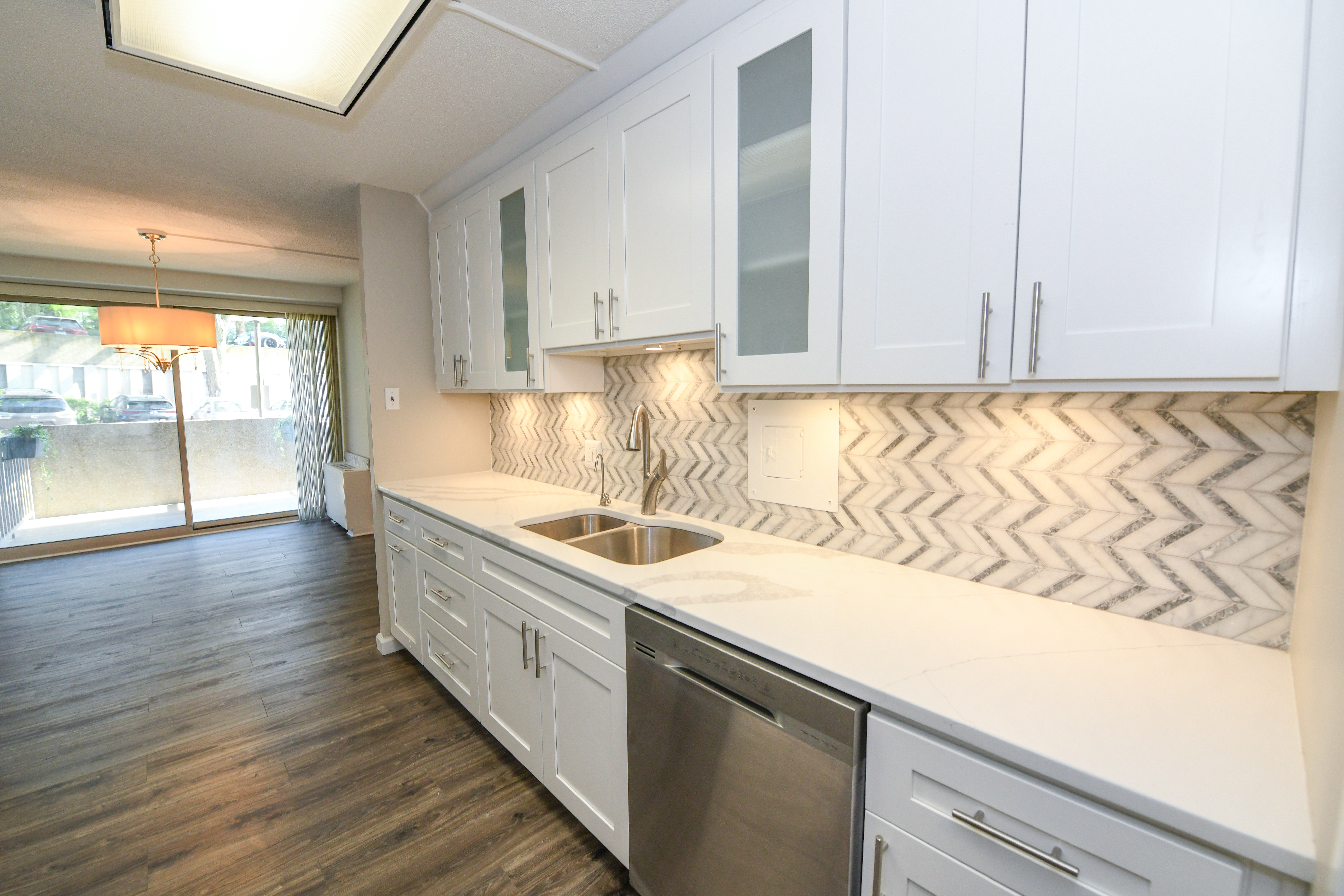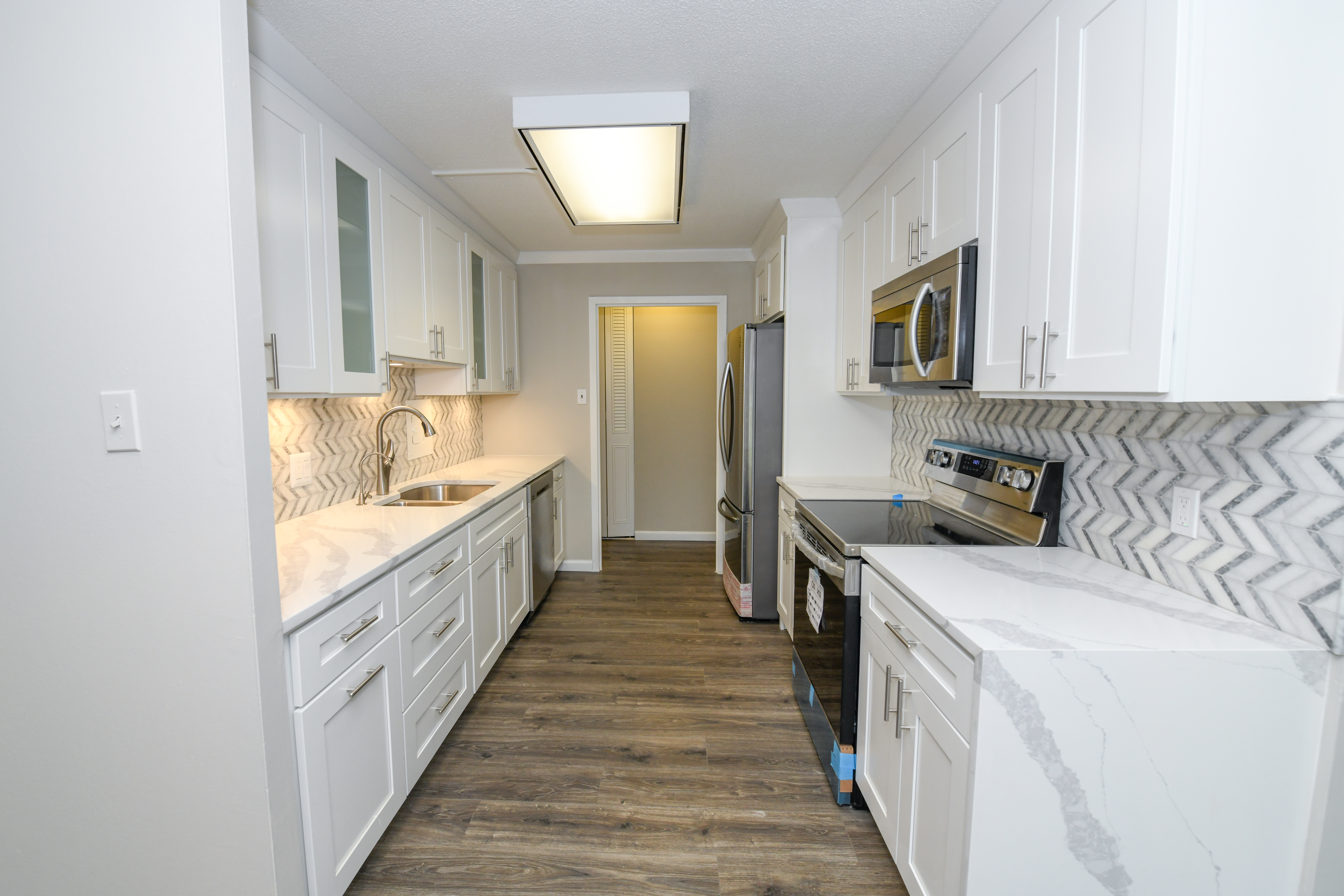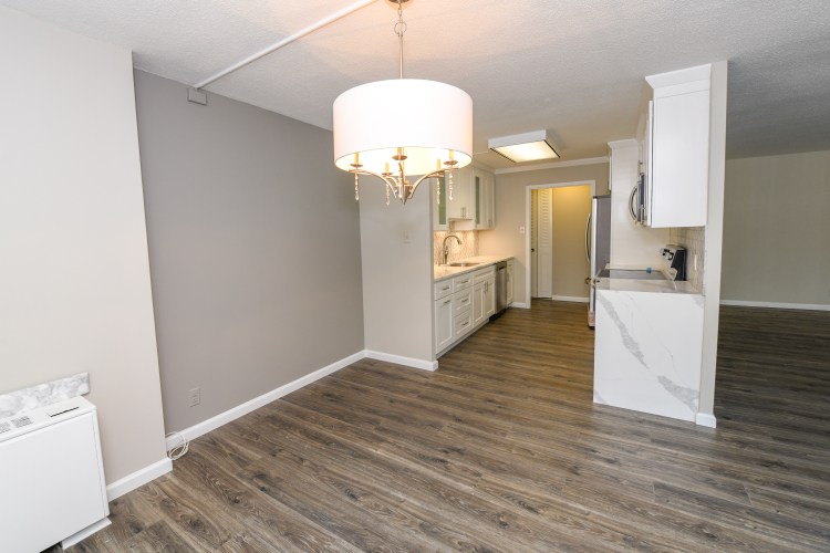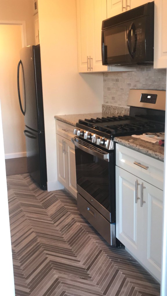 The floors of the rooms and closets in each entire unit is replaced with first quality waterproof, vinyl- clad wood flooring. This permits easy (reduced) maintenance and easy cleanup when the inevitable “spills” take place. Further, all surfaces are cleaned and professionally prepared and, where applicable, painted. And for an aesthetically pleasing result, new baseboard is installed throughout.